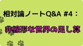 相対論 相対論ノート:Q&A #4 非線形な世界の足し算 あくまで個人的にまとめたノートなので、誤っている箇所があるかもしれません。参考にする際は内容の正当性について注意してくだ... 2025.09.17 相対論